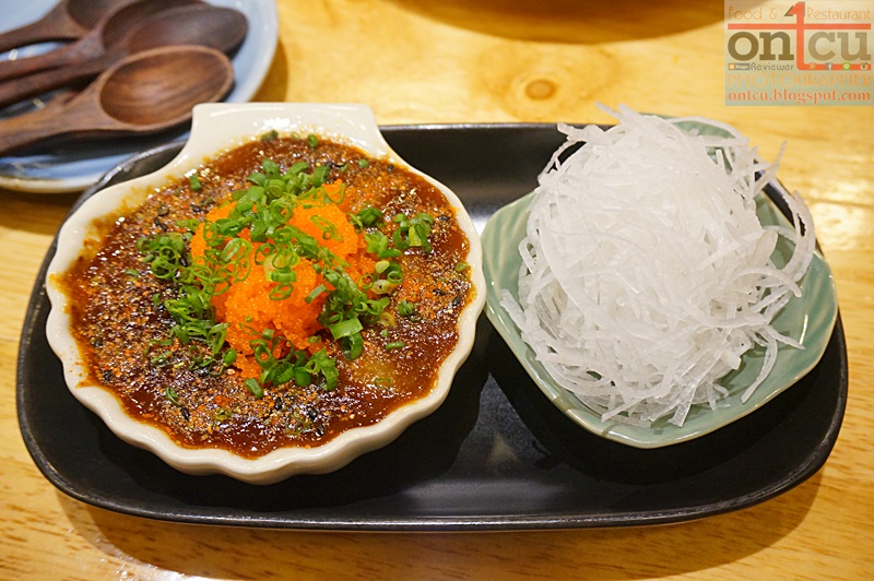 คลุกเค้ากับเนื้อหอยเชลล์สด โรยด้วยชิจิมิเพื่อเพิ่มรส