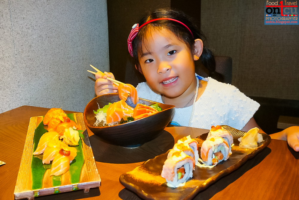มาพร้อมกับเนื้อปลาซาซิมิ 3 ชนิดคือ มากุโร่ ฮามาจิ และแซลมอน